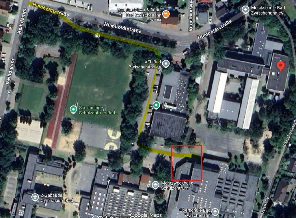 Der Weg zu unserem Probenraum im Forum der Oberschule Bad Zwischenahn (rotes Quadrat).