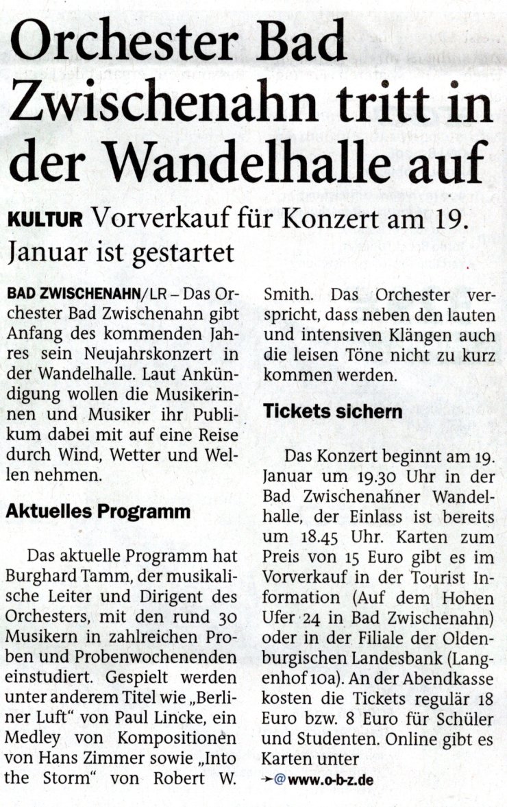 Artikel über die Neujahrskonzerte vom 13.01.2023 und 14.01.2023 in der Wandelhalle Bad Zwischenahn sowie 22.01.2023 in der Kath. Kirche Ss. Cosmas und Damian Barßel